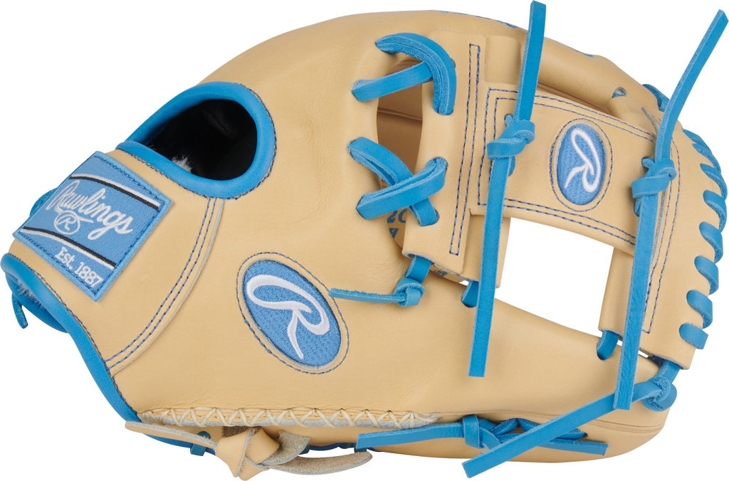 Turn heads and turn two with the Rawlings Pro Preferred 11.5-Inch Infield Glove, crafted for elite performance and bold style. Featuring a sharp Camel and Columbia Blue colorway, this glove is built for infielders who want their glove to work hard and look even better. The trusted 200 pattern and Pro I web are favorites among middle infielders, thanks to their reliable pocket and fast, consistent transfers. Whether you're making slick backhands or feeding the double play, this glove gives you the control and precision needed to lock down the infield. Built from top-tier kip leather, the Pro Preferred series offers a buttery-soft feel, exceptional shape retention, and lasting durability. Inside, the Pittards sheepskin palm lining keeps your hand dry and comfortable, while the padded thumb sleeve and 100% wool padding provide structure and stability inning after inning. Bring flair and confidence to your game with the Rawlings Pro Preferred 11.5-Inch Infield Glove.